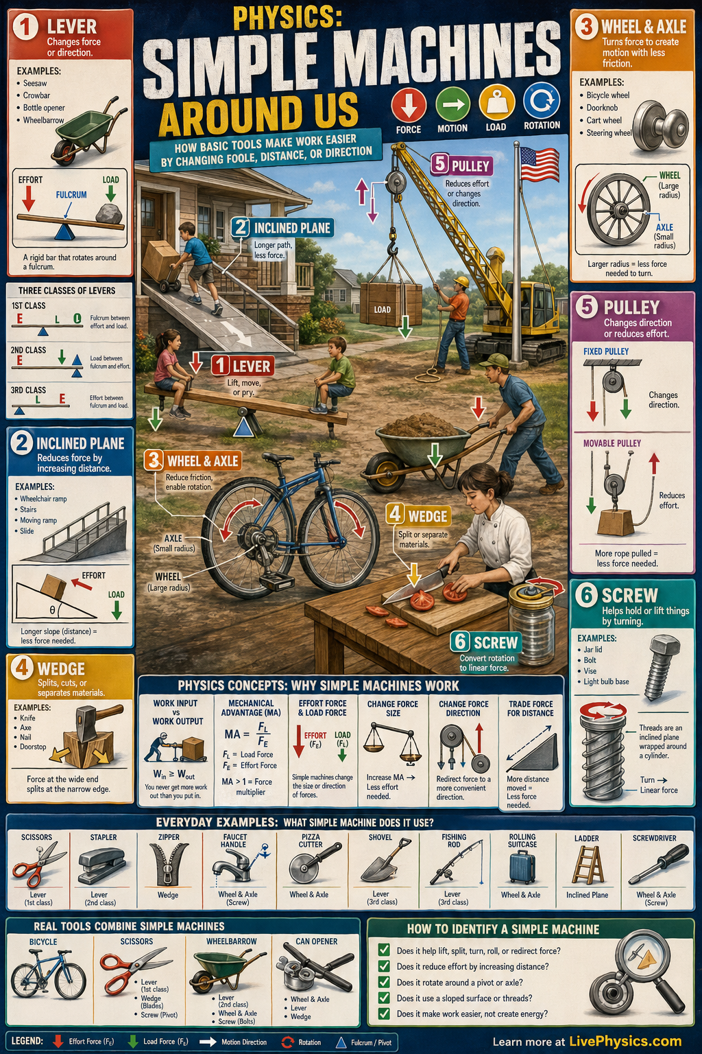 Simple machines are basic devices that make work easier by changing the size or direction of a force. Even though they are simple, they appear everywhere in daily life, from opening a jar to riding a bicycle or lifting a flag. Learning about them helps students connect physics ideas to familiar objects. The six classical simple machines are the lever, wheel and axle, pulley, inclined plane, wedge, and screw.