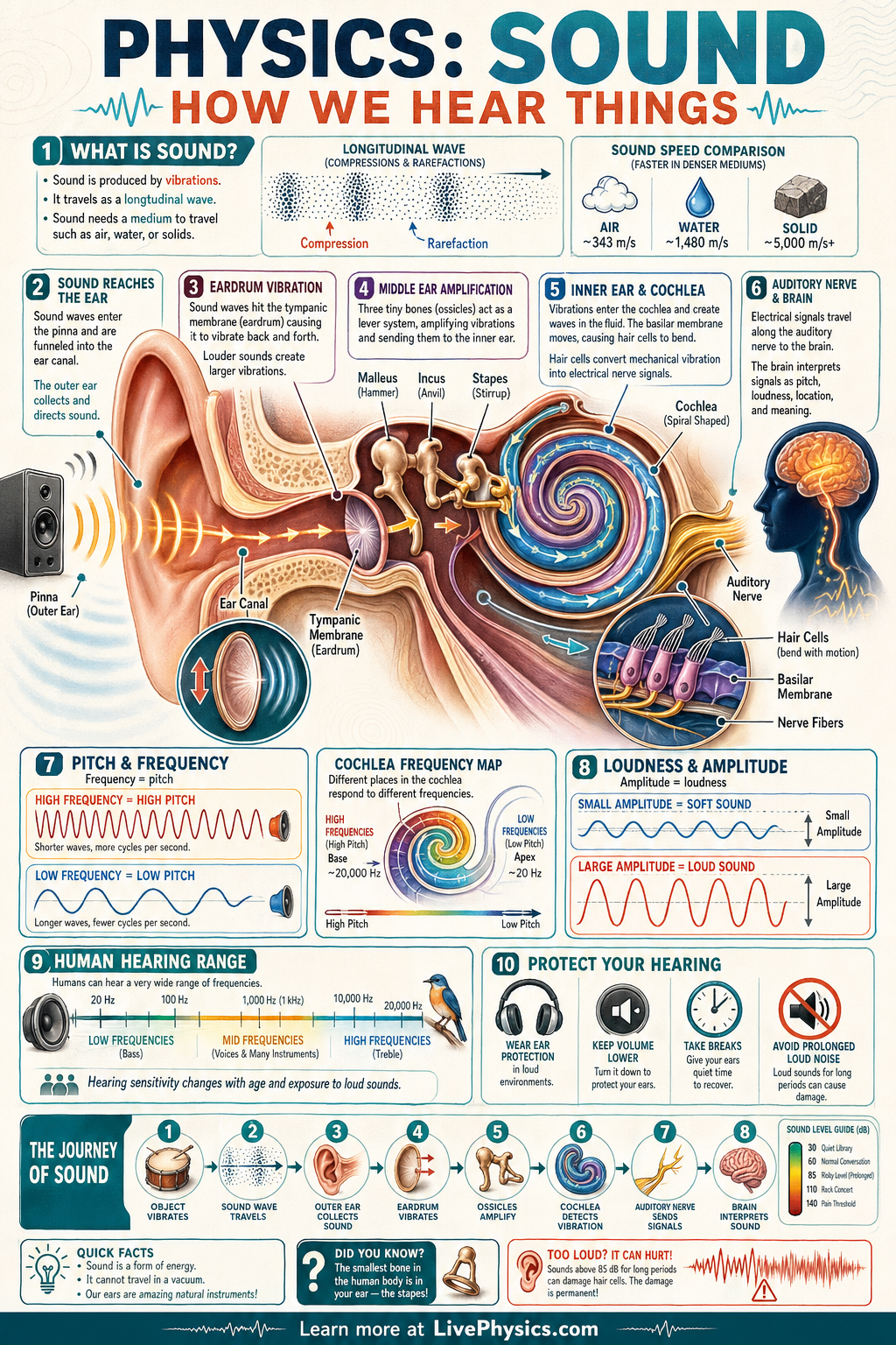Sound is a form of mechanical energy that travels through matter as a longitudinal wave. In air, vibrating objects create regions of compression and rarefaction that move outward and carry energy to a listener. Hearing matters because it lets humans communicate, detect danger, enjoy music, and gather information about the environment. Physics explains both how sound moves through a medium and how the ear converts that motion into signals the brain can understand.