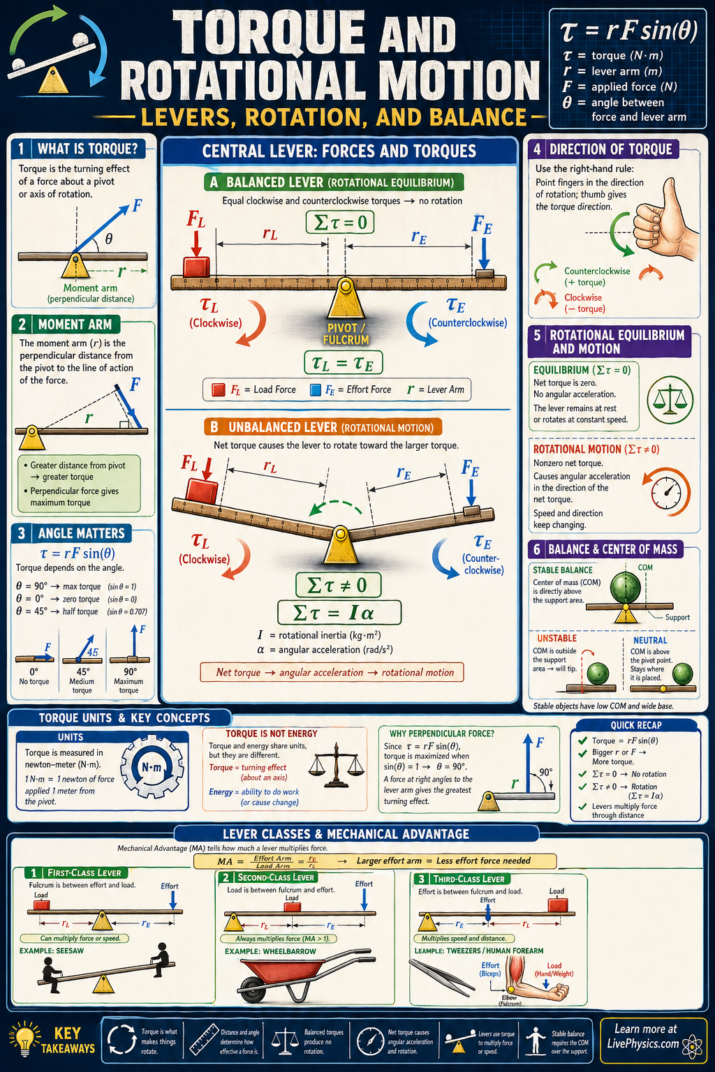 Torque explains how forces cause objects to rotate, and it is one of the main ideas behind levers, doors, wrenches, and seesaws. A force can be large but still produce little rotation if it acts close to the pivot. A smaller force can create a bigger turning effect if it acts farther from the pivot. Understanding torque helps students connect linear motion ideas like force with rotational motion and balance.