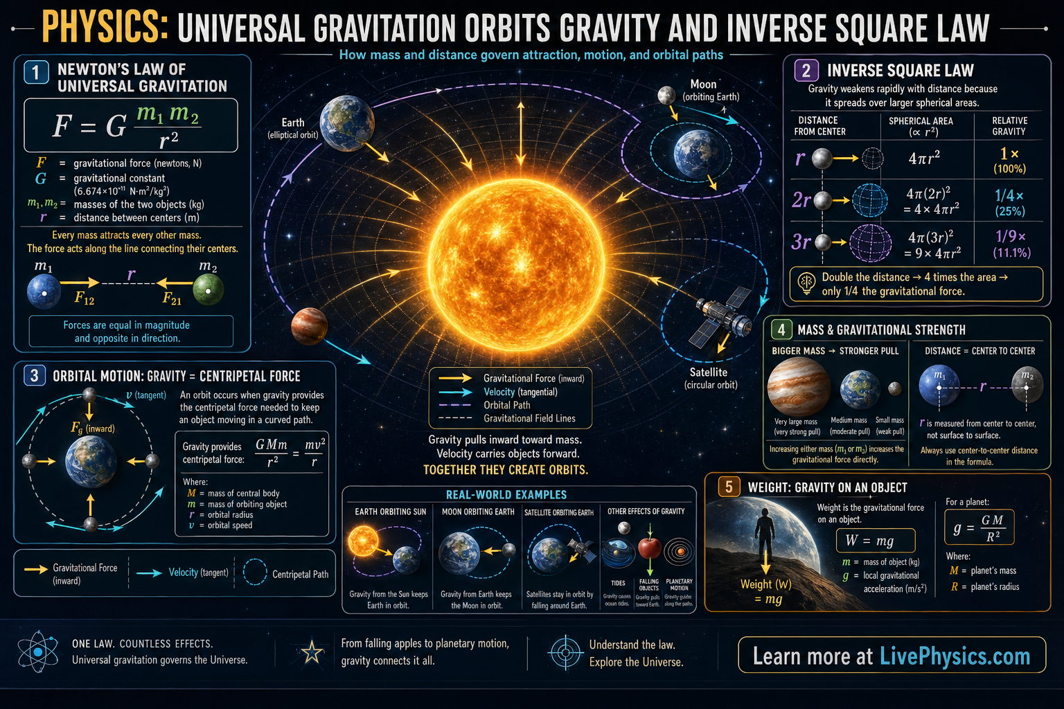 The gravitational force gets weaker with distance according to an inverse square law, so doubling the distance makes the force four times smaller. Orbits happen when gravity continuously pulls an object inward while the object's velocity carries it forward. This balance creates circular or elliptical paths instead of straight-line motion. The same physics can be used to calculate satellite motion, planetary periods, and escape speed.