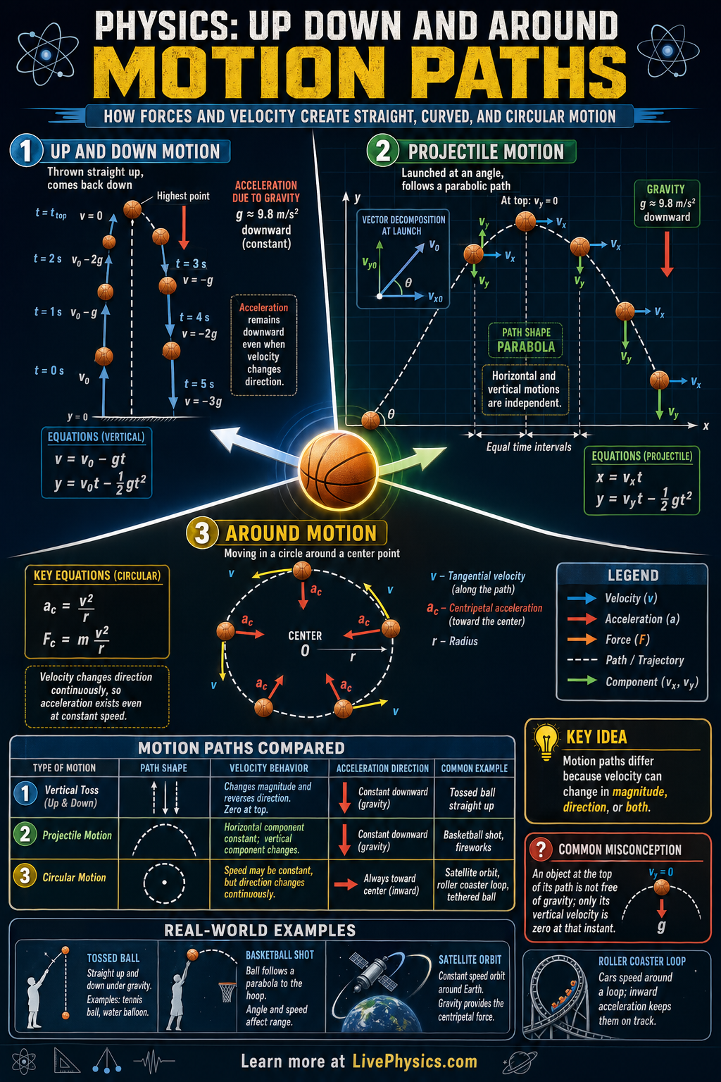 Upward and downward motion is strongly shaped by gravity, which produces a nearly constant downward acceleration near Earth's surface. Curved and circular motion happen when a force changes the direction of motion, even if speed stays constant. By comparing straight up and down motion with turning and orbiting motion, students can see that the path of an object reveals the forces acting on it.