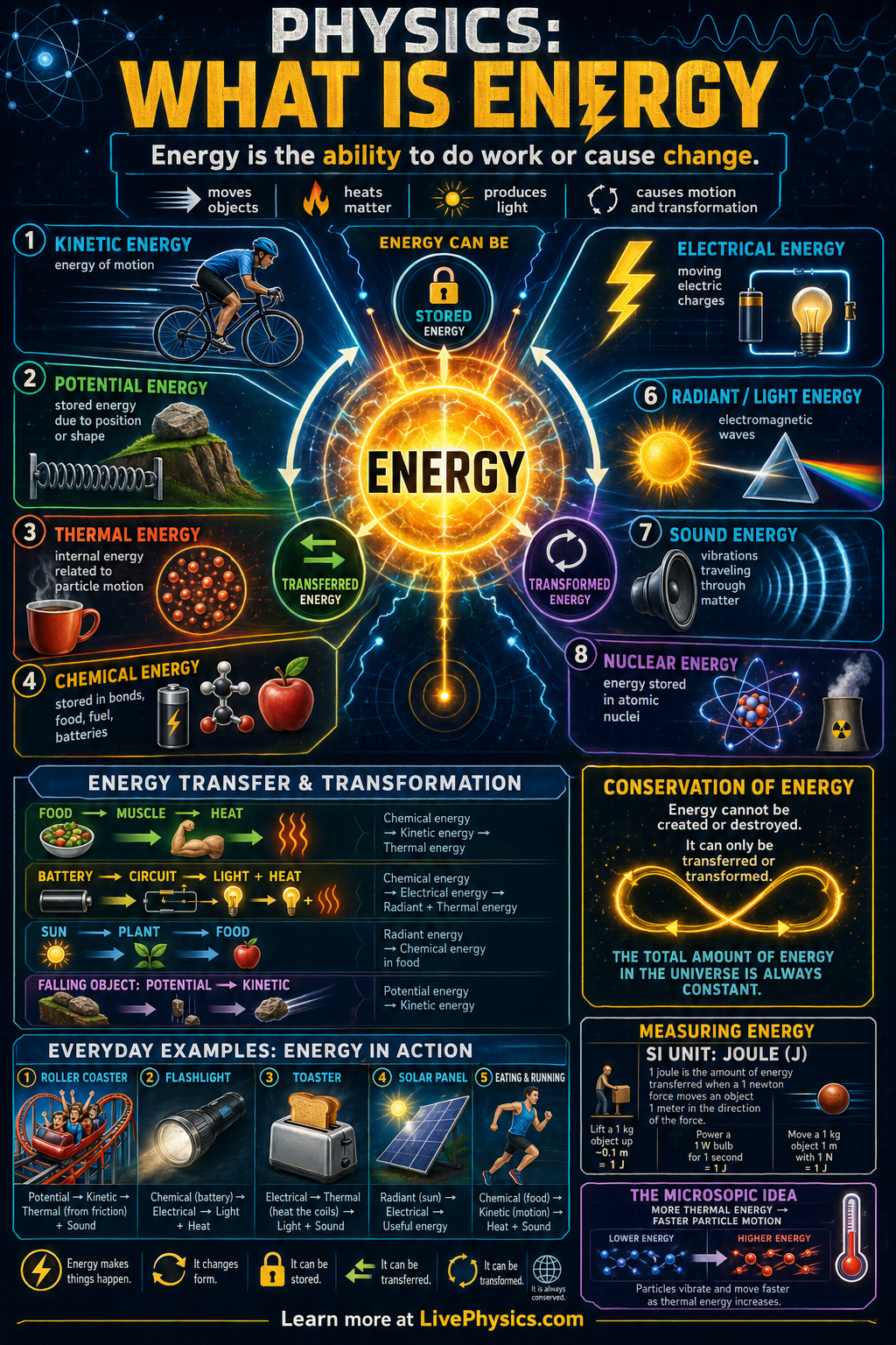 Energy is one of the most important ideas in physics because it connects motion, heat, electricity, light, and chemical reactions under one concept. In simple terms, energy is the ability to do work or cause change. We use it to describe why objects move, why batteries power devices, and why stars shine. Understanding energy helps students explain many different physical processes with the same basic principles.