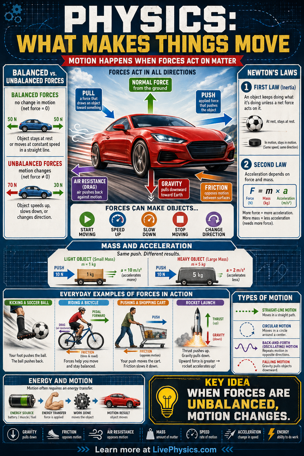 Physics explains motion by connecting forces to changes in speed and direction. Every time a car accelerates, a ball rolls to a stop, or a bicycle turns a corner, forces are acting. Learning what makes things move helps students describe everyday events with clear rules instead of guesses. It also builds the foundation for engineering, sports science, transportation, and space travel.