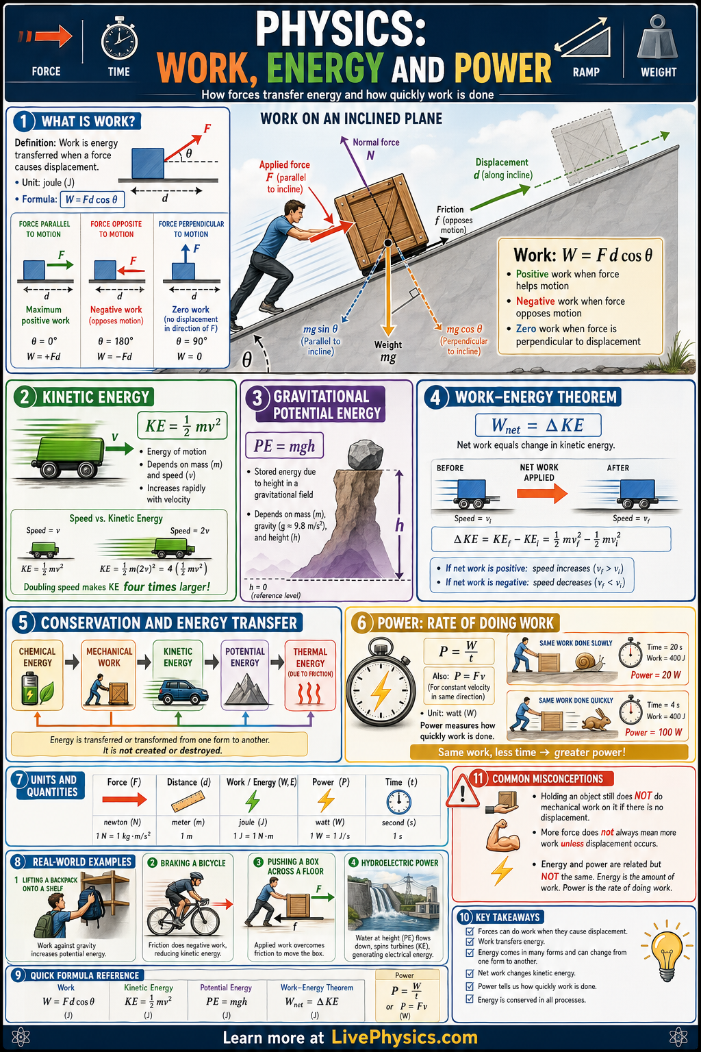 When a force acts through a displacement, it can do work and change an object's energy. The work-energy theorem states that the net work on an object equals its change in kinetic energy, while gravity and elastic forces can store energy as potential energy. On an inclined plane, applied force, friction, and the component of weight along the slope all affect the energy balance. Power adds the time dimension by measuring how quickly work is done or energy is transferred.