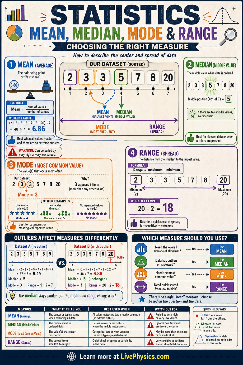 - Use mean for roughly symmetric data, median for skewed data or outliers, mode for most common value, and range for quick spread.