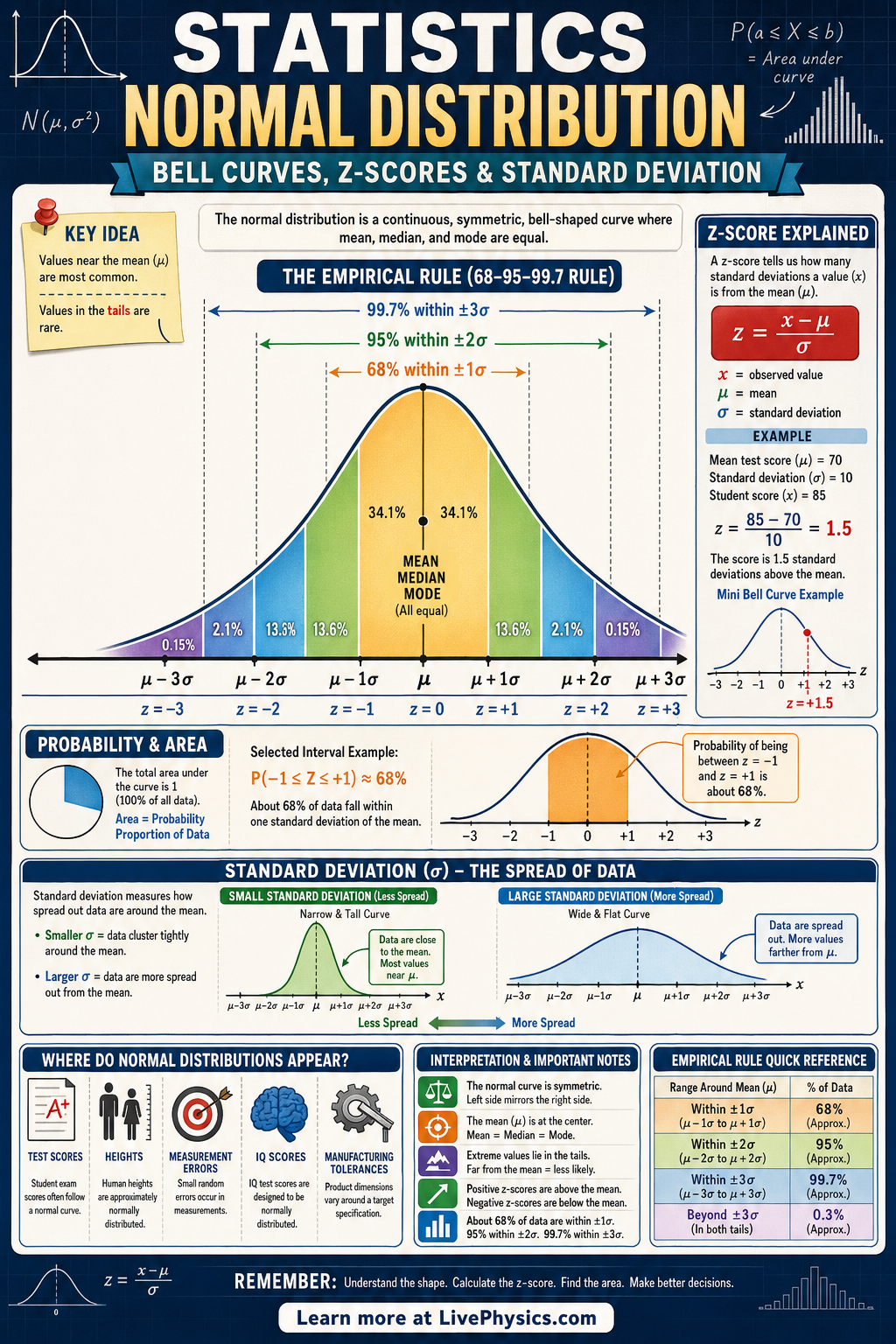 The normal distribution is one of the most important ideas in statistics because many real measurements cluster around an average and become less common as you move away from it. Its graph is the bell curve, a symmetric shape centered at the mean. Understanding this curve helps students describe data, compare values, and estimate probabilities. It is used in fields such as test scoring, biology, manufacturing, and social science.