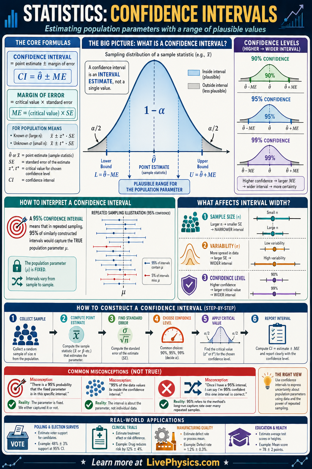 - Thinking a higher confidence level makes the interval narrower, which is wrong because higher confidence requires a larger critical value and therefore a wider interval.