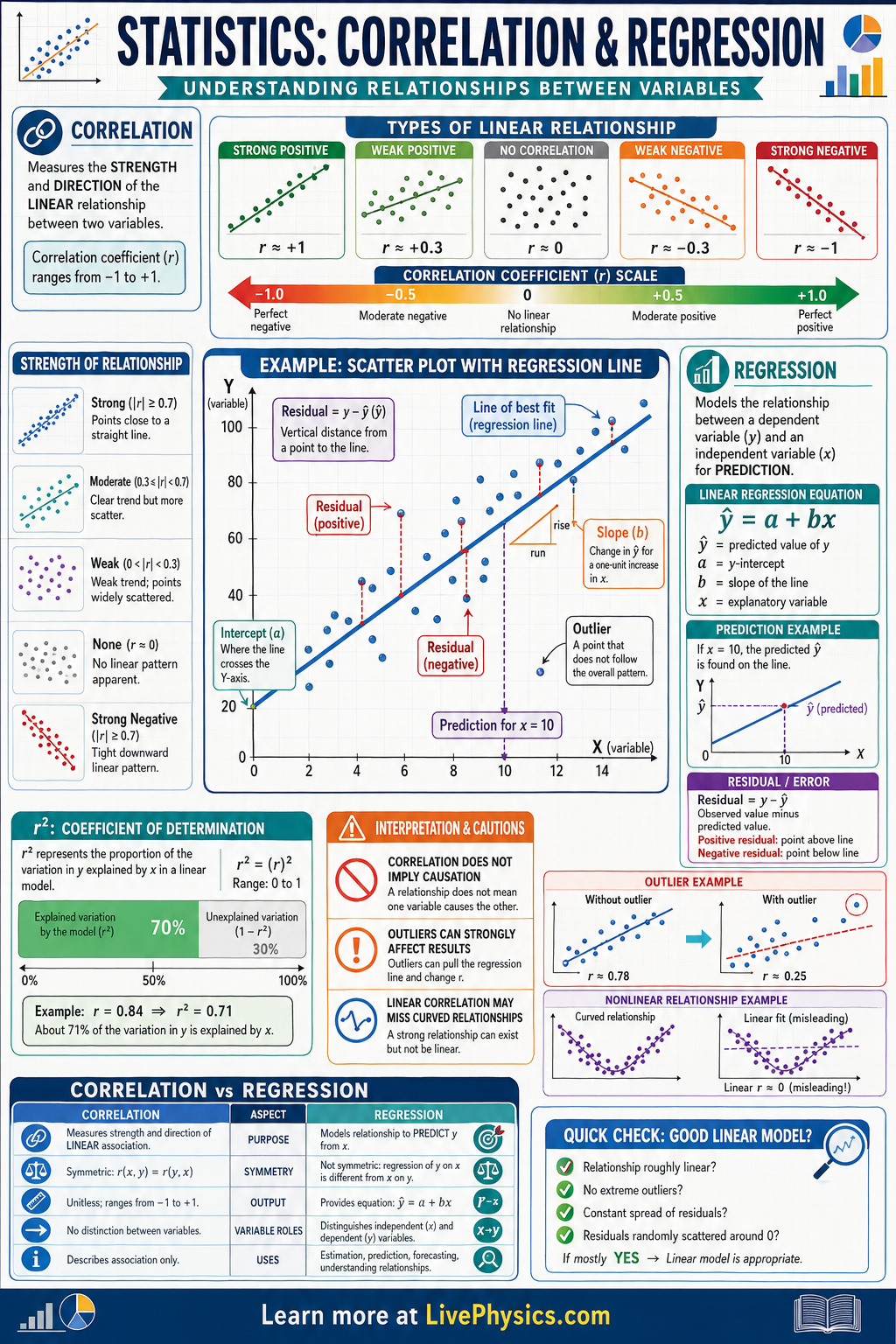 A scatter plot is usually the starting point because it shows whether a linear pattern is reasonable. The correlation coefficient r measures the strength and direction of a linear association, with values from -1 to 1. A regression line, often written as y = a + bx, estimates the average change in y for each one unit increase in x. Good analysis also checks for outliers, nonlinearity, and the important fact that correlation alone does not prove causation.