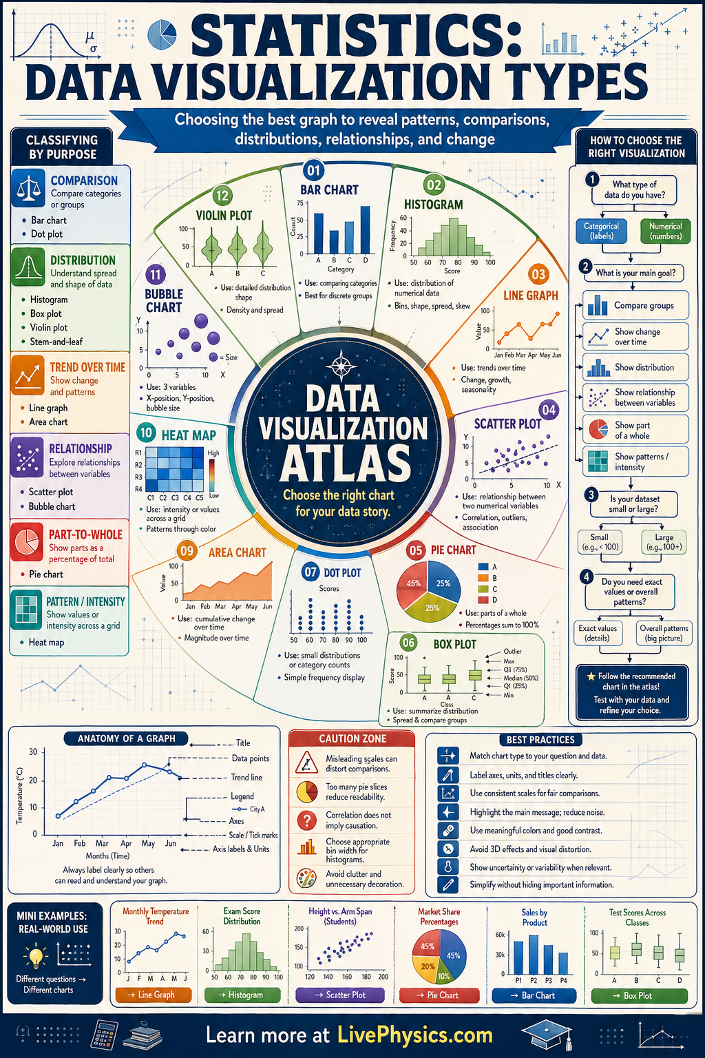 Data visualization turns raw numbers into pictures that are easier to interpret. Different graph types are designed for different kinds of data and different questions. Choosing the right display helps students spot patterns, compare groups, and communicate results clearly. A poor graph choice can hide important information or even suggest the wrong conclusion.