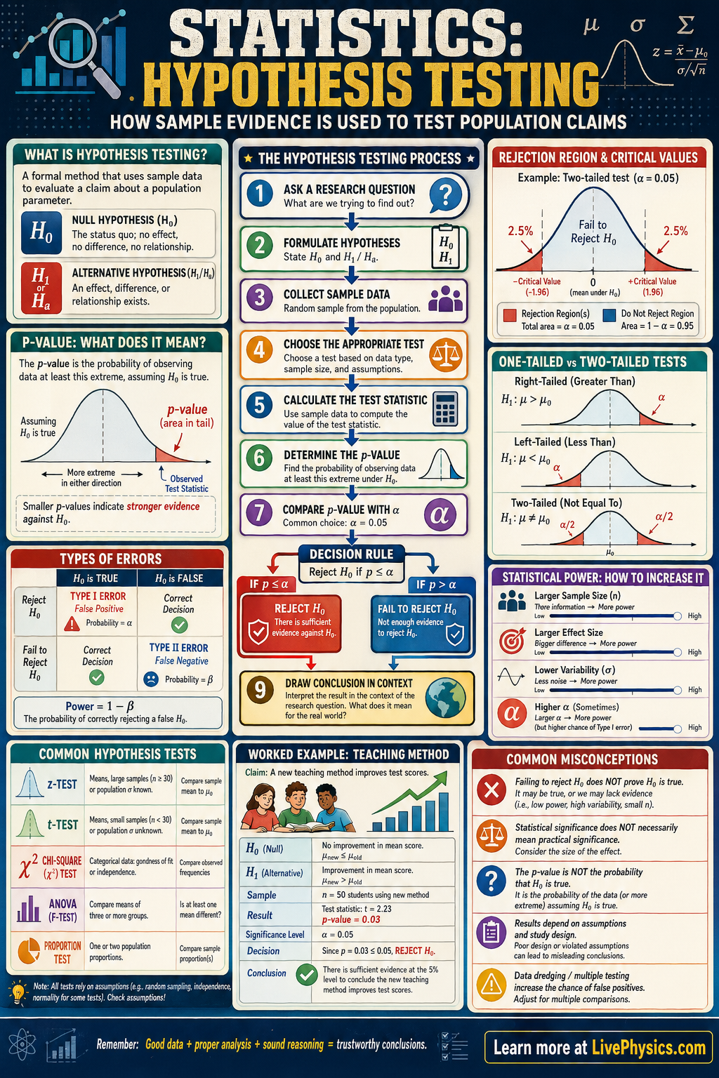 - Confusing fail to reject H0 with proving H0 true, which is wrong because the test may simply lack enough evidence or sample size to detect a real effect.