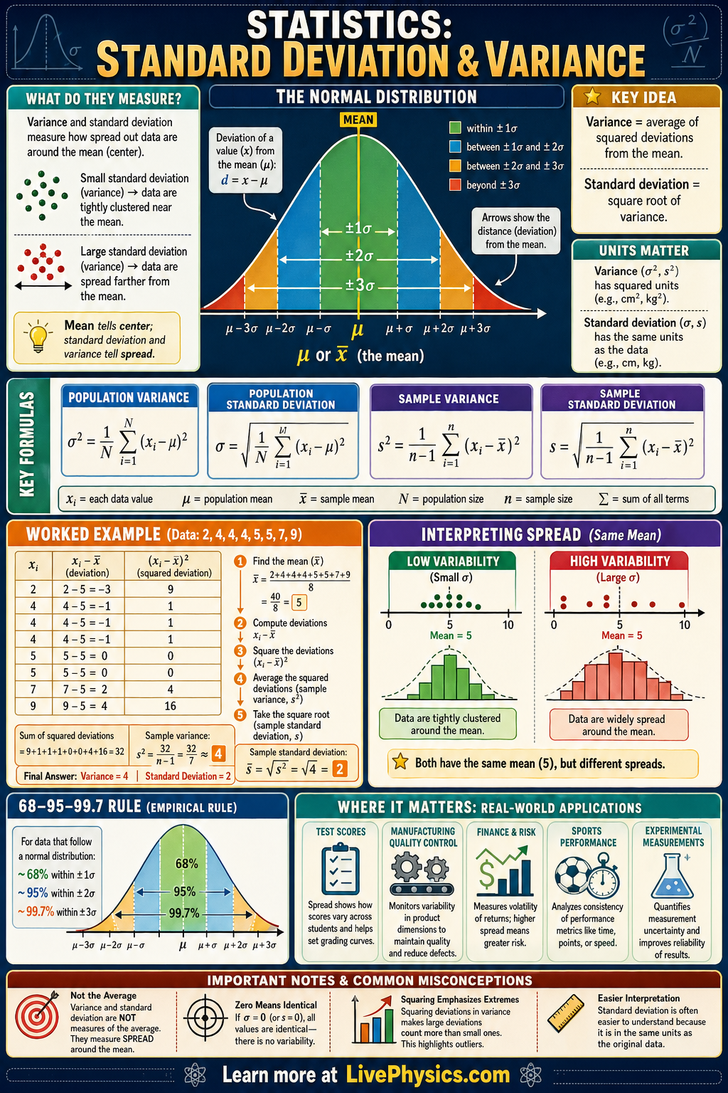 Variance and standard deviation are measures of how spread out data values are around the mean. They help describe whether a dataset is tightly clustered or widely scattered. This matters in science, economics, testing, and engineering because two datasets can have the same average but very different variability. Understanding spread gives a fuller picture than the mean alone.